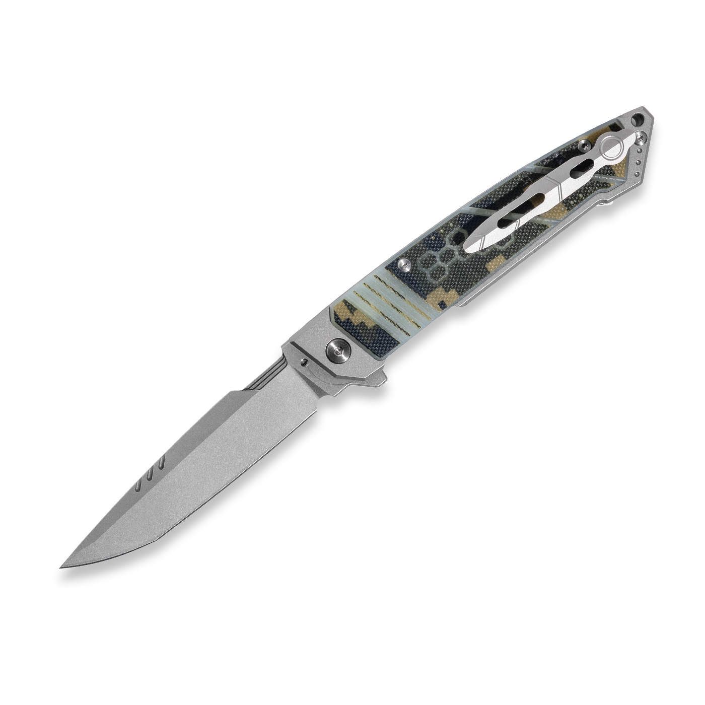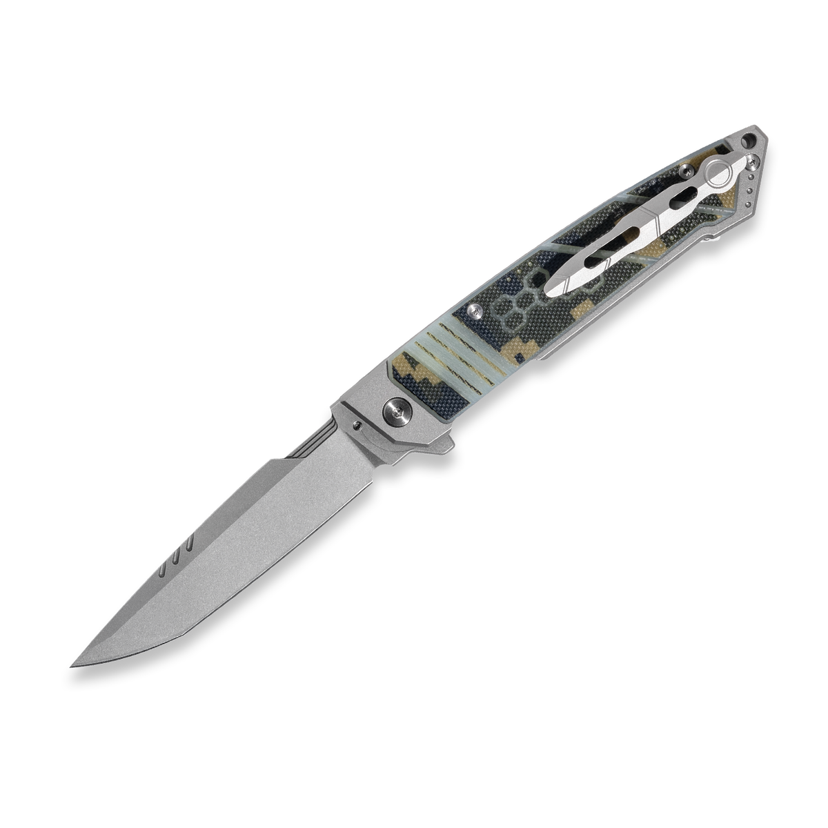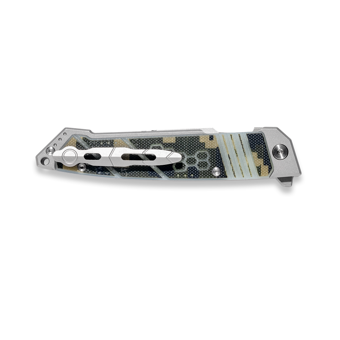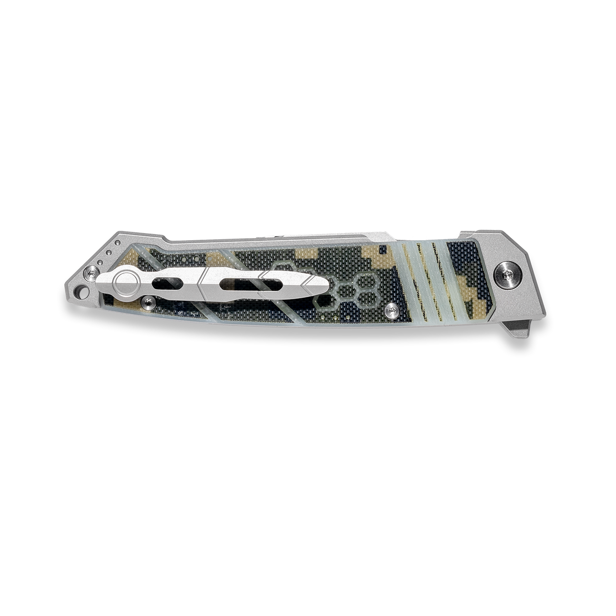 Features a rugged camo green G10 handle that combines tactical aesthetics with practical functionality. The textured surface provides a non-slip grip in all conditions, while the durable construction ensures long-lasting performance.