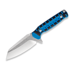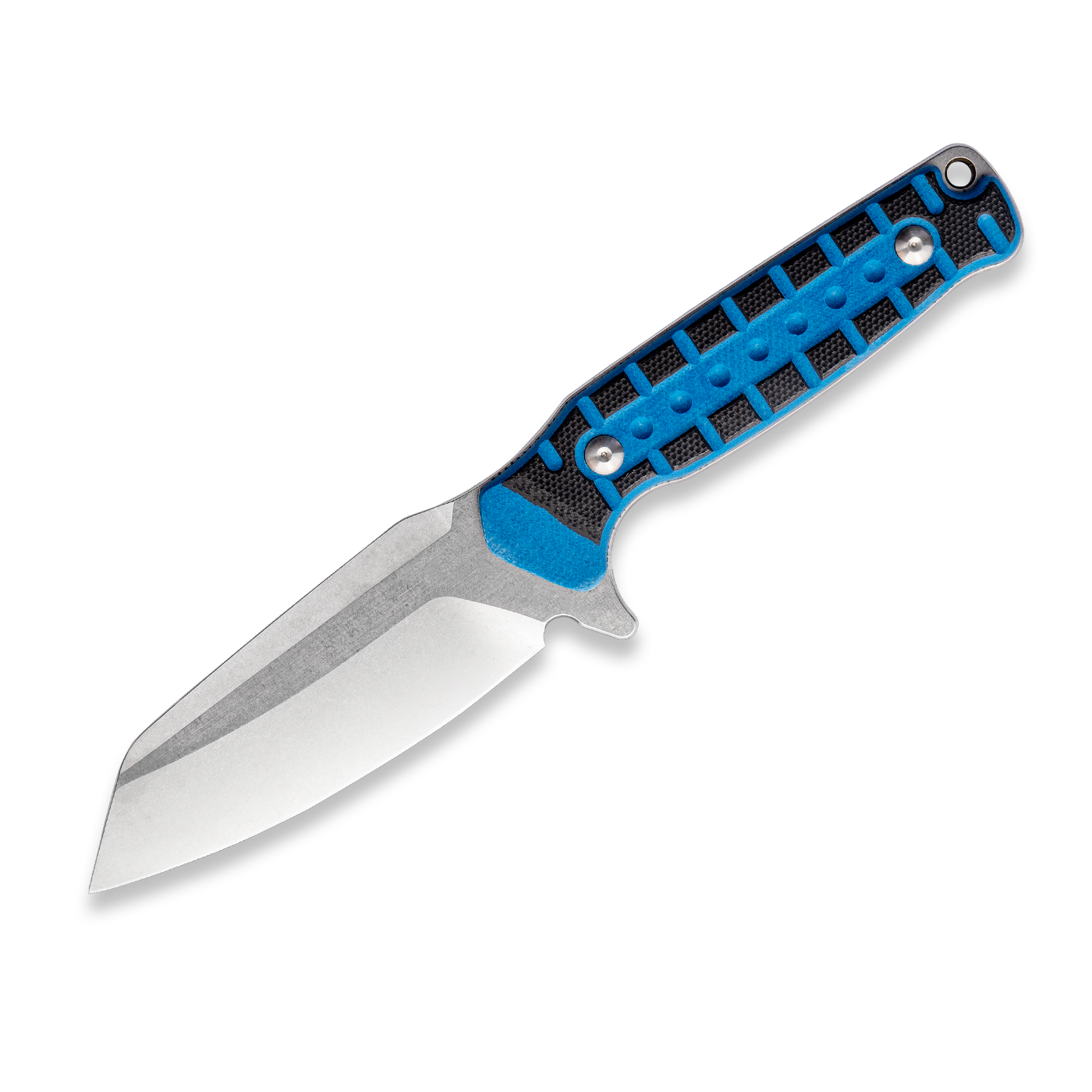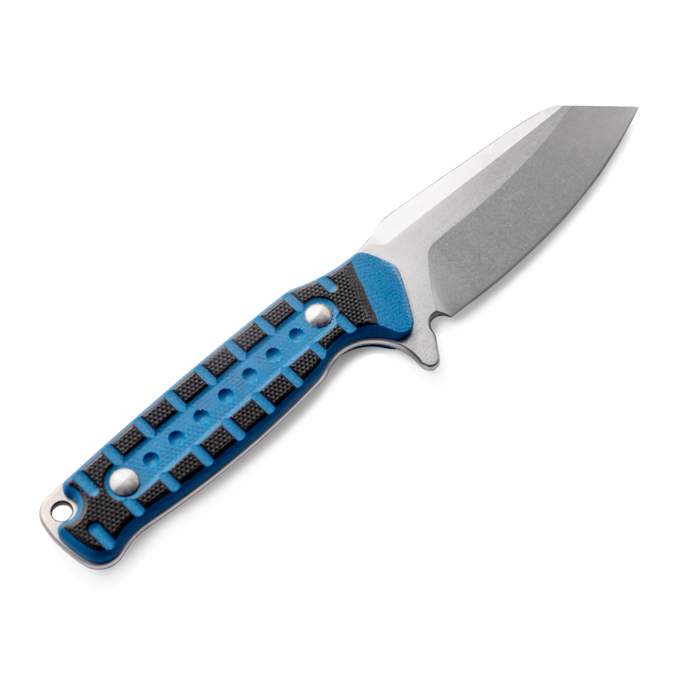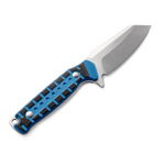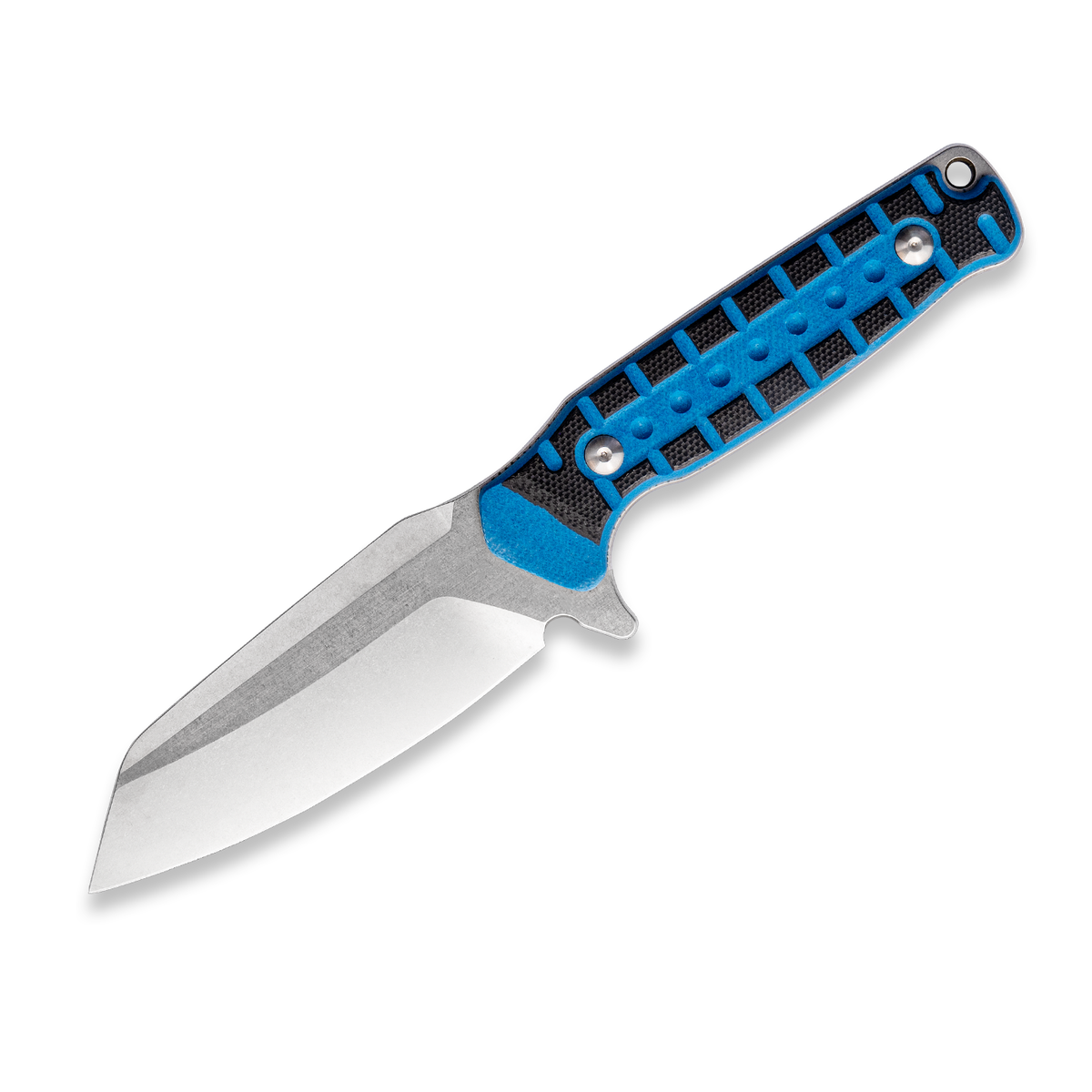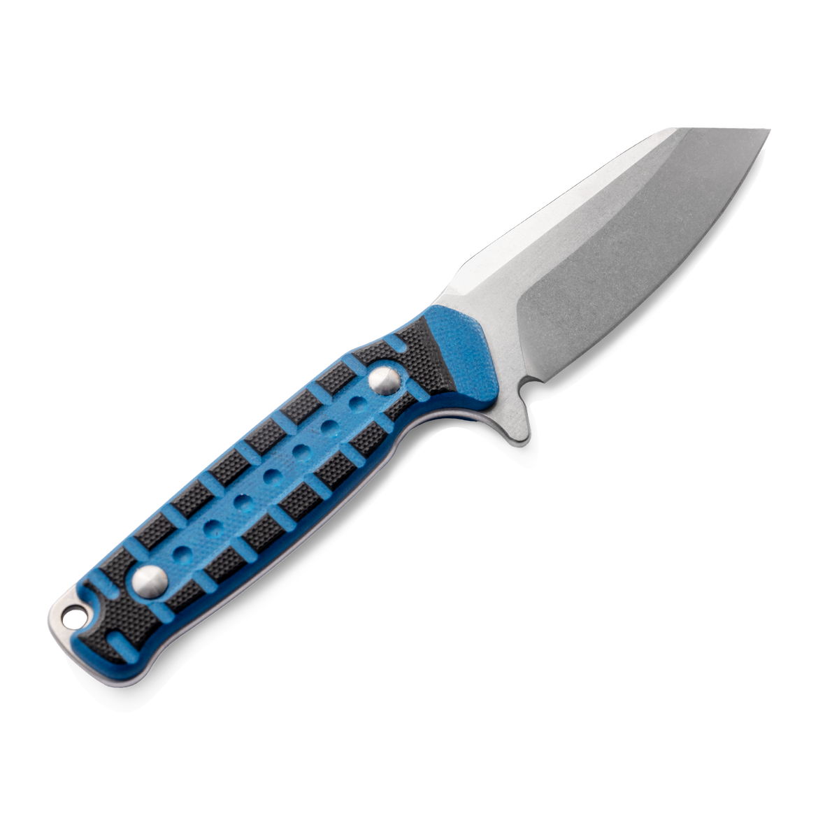 Features a durable two-tone G10 handle that combines dusk blue and black layers. This construction ensures a secure, non-slip grip in all conditions while providing a distinctive tactical appearance.
