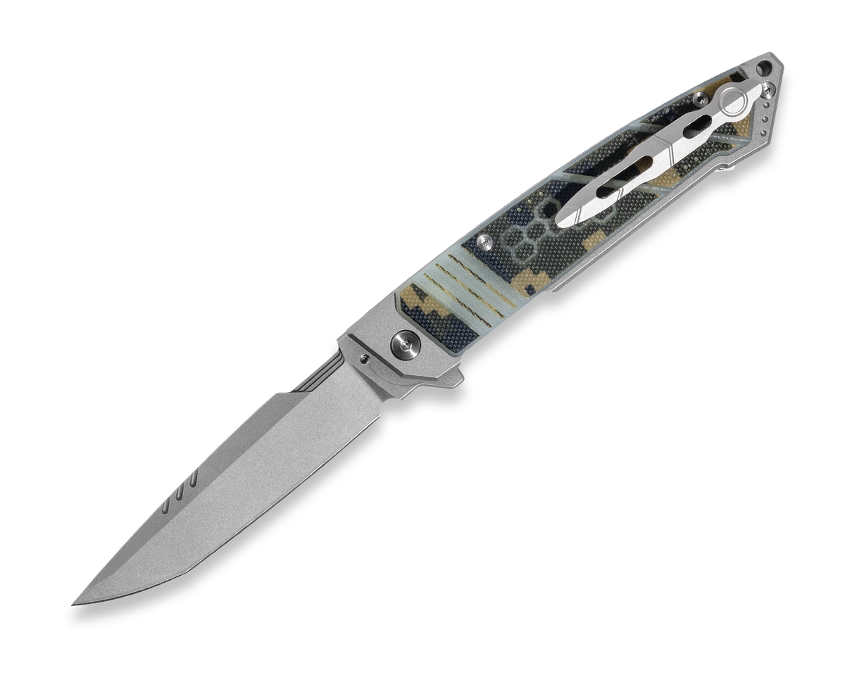 Features a rugged camo green G10 handle that combines tactical aesthetics with practical functionality. The textured surface provides a non-slip grip in all conditions, while the durable construction ensures long-lasting performance.