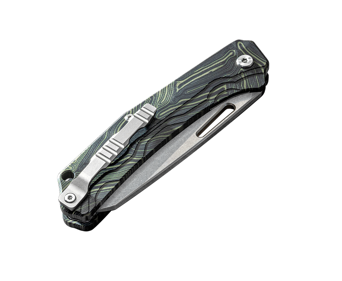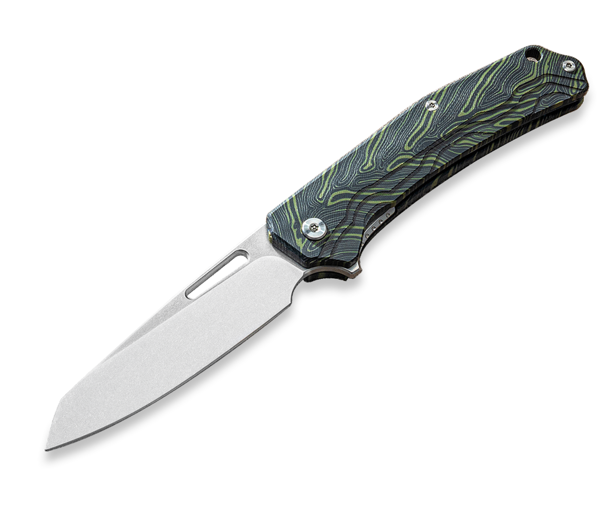 Features a rugged green G10 handle that combines tactical aesthetics with practical functionality. The textured surface provides a non-slip grip in all conditions, while the durable construction ensures long-lasting performance.