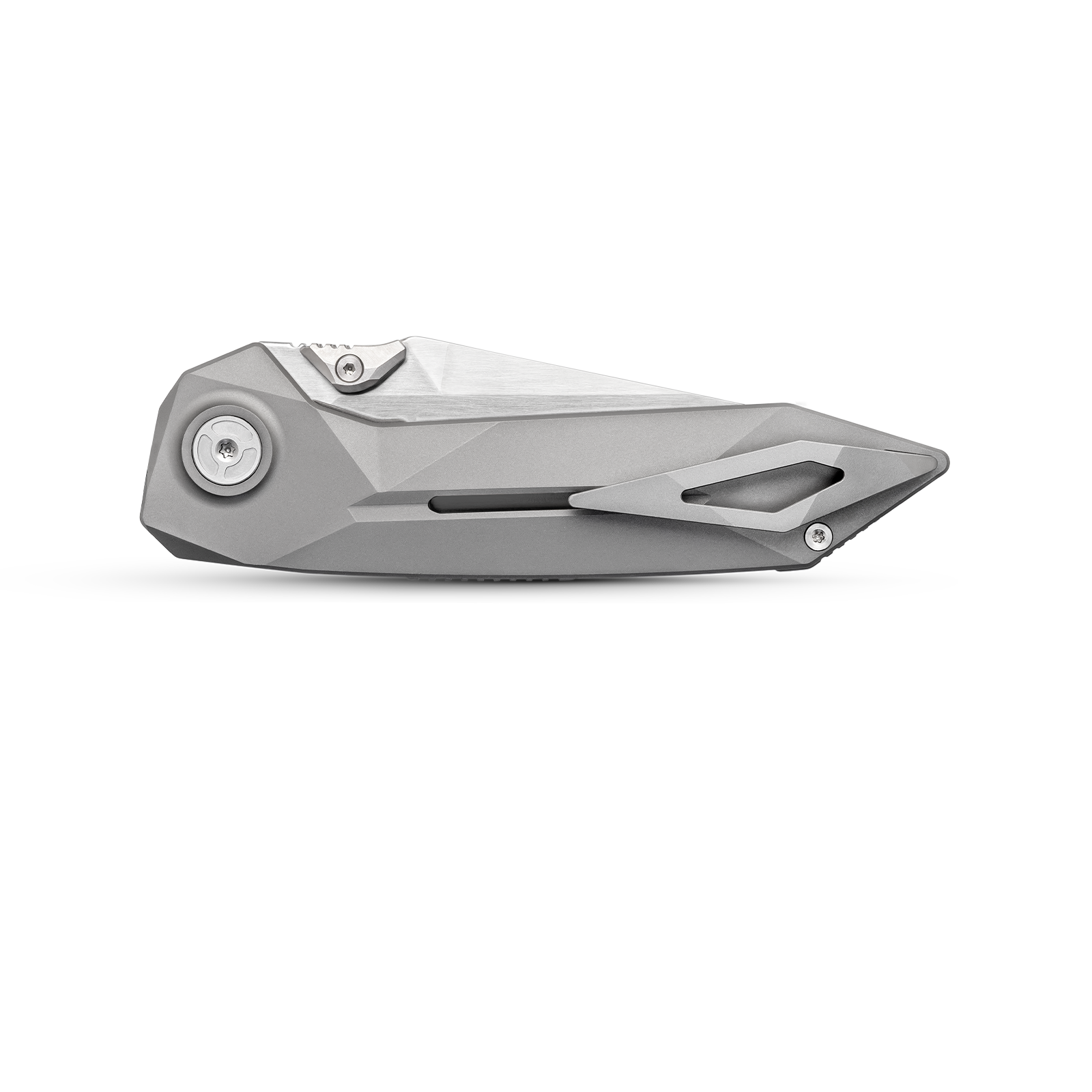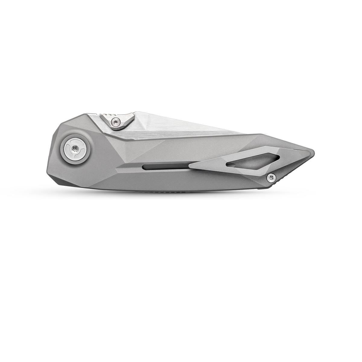 The handle is machined from titanium alloy, offering high strength without the weight. The stepped angular design ensures a solid grip while enhancing its futuristic visual appeal.